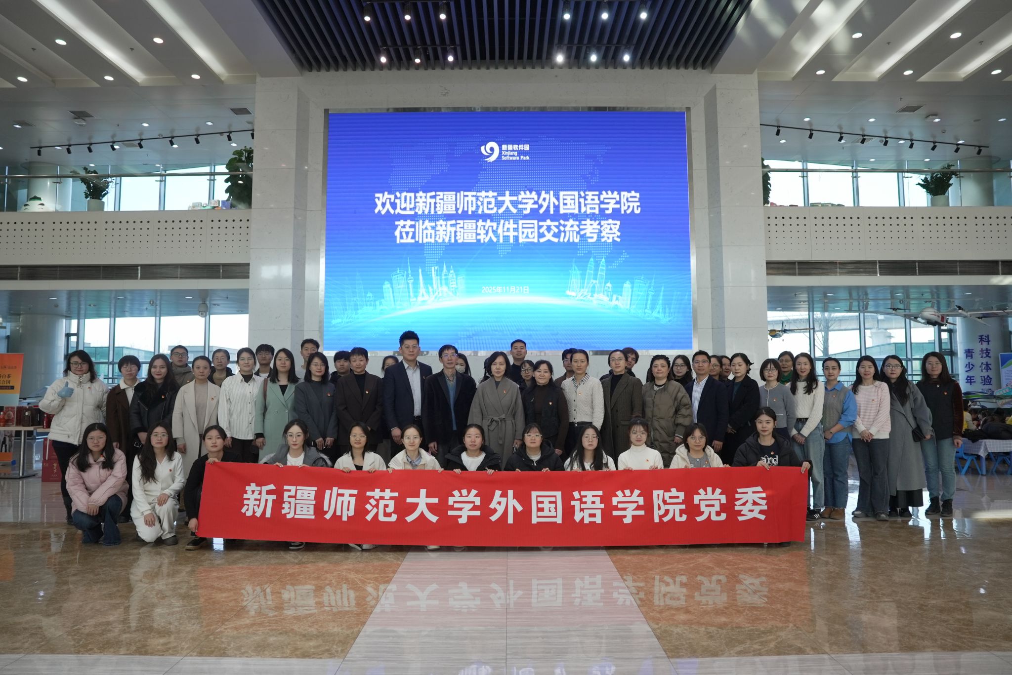 为深入学习贯彻党的二十届四中全会精神,积极探索党建引领事业发展的新路径,11月21日,永利官网外国语学院党委组织师生党员代表赴新疆软件园开展“党旗映天山”主题党日活动。本次活动聚焦新疆经济社会高质量发展需求,通过实地考察、深度交流与合作洽谈,积极探索党建与业务发展深度融合的新路径。