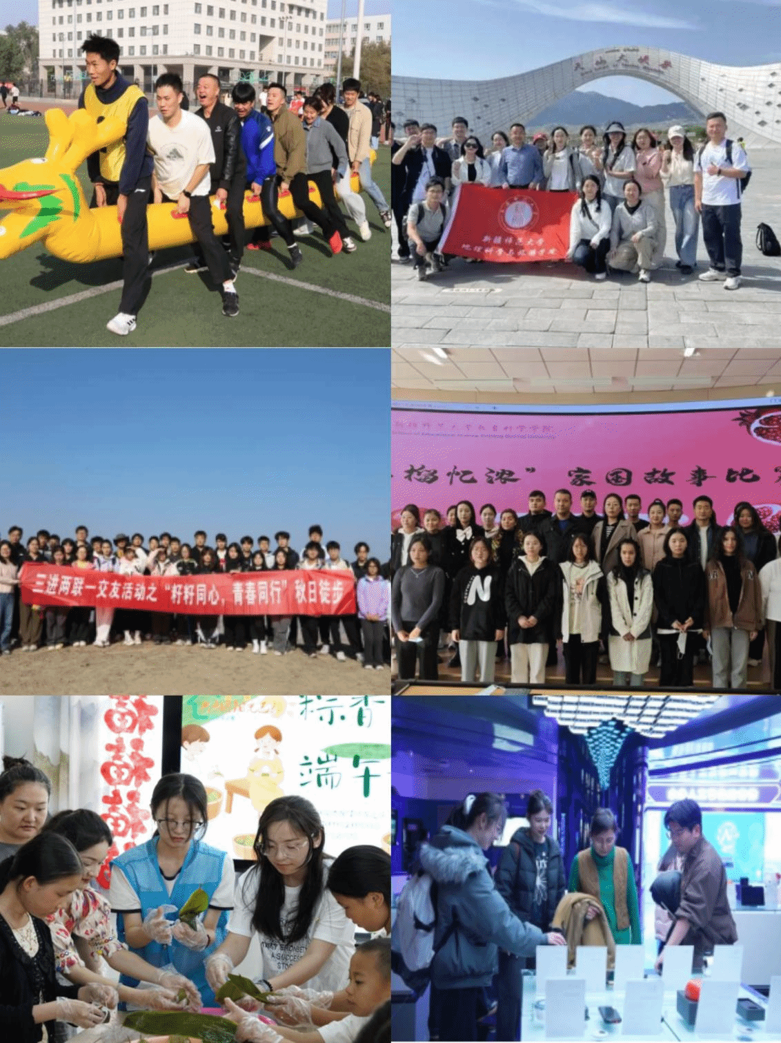 立足育人初心,学校将“三进两联一交友”活动与教学实践、文化传承深度融合,全年累计开展各类主题活动500余场,参与师生超万人次。马克思主义学院在中秋佳节组织师生共制传统花灯,于佳节氛围中畅叙师生情、共话团结意;商学院借国庆、中秋双节契机开展“进宿舍送关怀”活动,手写祝福贺卡、打包慰问礼包,让异乡学子感受“家的温暖”;地理科学与旅游学院组织师生赴天山大峡谷开展研学实践,在专业探索中深化情感联结;物理与电子工程学院组织师生党员及联系学生参观“天山放歌”主题摄影展,通过光影艺术感受新疆发展新貌与各族群众团结奋进的动人场景;计算机科学技术学院将活动与团课学习结合,围绕“纪念中国人民抗日战争暨世界反法西斯战争胜利80周年”分享感悟、凝聚共识;美术学院、音乐学院以艺术为媒,开展纸鸢共制、剪纸创作、海报设计、书信摄影等活动,将民族团结元素融入艺术创作;体育学院举办“龙舟竞渡迎端午”趣味竞技活动,让师生在传统节日中感悟中华优秀传统文化魅力,增强文化自信。