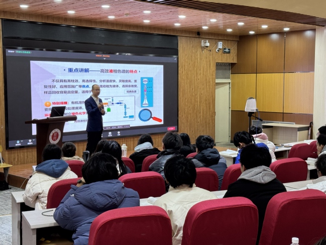 关明教授循循善诱,合理设置课堂提问和学生展示环节,三校学生积极参与互动,课堂气氛活跃。重点知识点讲解完毕后,关明教授通过智慧树知识图谱发布课堂习题,三校学生积极扫码参与作答。课程还将涉及手性物质的分离、中药材指纹图谱、新型色谱固定相、超高效液相色谱等科学研究成果融入教学内容,实现高阶知识的拓展延伸和科研育人。课程总结时,关明教授立足区情,及时抛出棉酚的检测方法问题,同时布置了关于正相液相色谱和反相液相色谱的定义及应用的学习任务,实现项目式、研讨式学习任务的发布,切实发挥学生自主学习的主观能动性,将OBE 教学理念贯穿于课堂教学全过程。