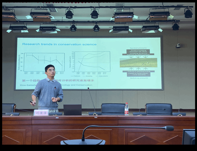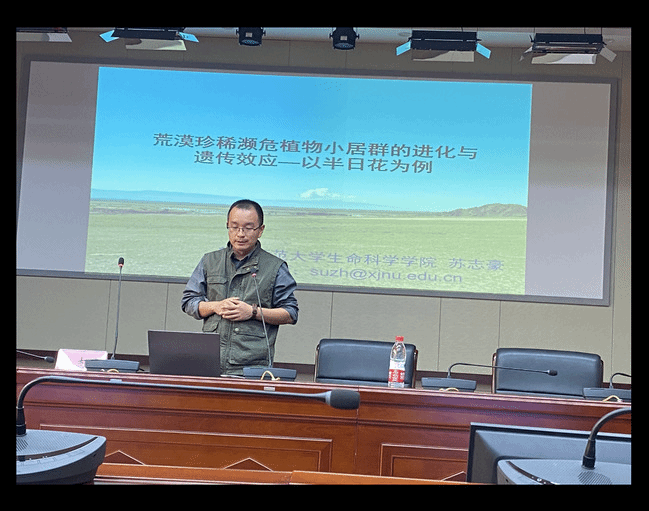 张健在报告中介绍了生物多样性研究的发展历程,解释了中国生物多样性研究的30个核心问题。黄晓磊介绍了如何利用多组学数据研究昆虫和植物等物种间关系。刘佳佳介绍了如何利用数据库探索全球生物多样性变化规律。苏志豪以濒危植物“半日花”为例,介绍了荒漠珍稀濒危植物小居群的进化与遗传效应。董正武介绍了荒漠植物水分利用的生态适应机制。