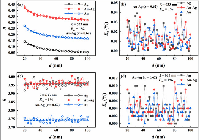 Au-Ag合金纳米颗粒由于其具有良好的结构稳定性、光热性能、折射率传感特性以及潜在的生物医学应用而受到广泛关注。当金属纳米颗粒与特定波长的入射光相互作用时,将会产生局域表面等离激元共振(Localized Surface Plasmon Resonance, LSPR)现象,在共振波长处,纳米颗粒强烈吸收和散射入射光。复折射率是影响颗粒LSPR特性的重要参数之一,其决定了颗粒在实际应用中的光学性质和行为。本文基于Mie散射理论提出了改进的等高线相交法,将其用于Au-Ag合金纳米颗粒复折射率的反演,并对反演结果的可靠性和稳定性进行了定量分析。