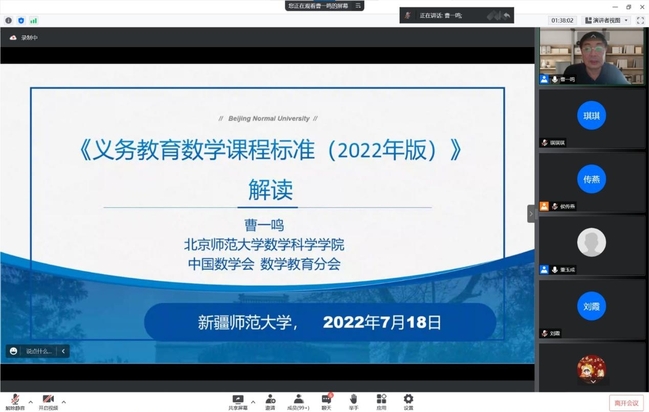 为加强对《义务教育课程方案和课程标准(2022年版)》的理解和领悟,全面把握新版义务教育课程标准的新理念和新特点,7月18日上午,数学科学学院举办2022年版义务教育数学课程标准解读线上讲座。来自全疆的一线数学教师、数学科学学院学科教学方向师生及协作单位乌鲁木齐市教研室、经开区教育局等近500余人参加了此次讲座。