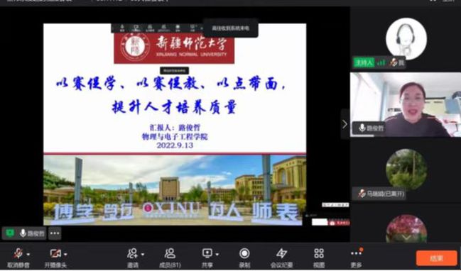 本次会议邀请在学科竞赛中成绩突出的物理与电子工程学院介绍组织、激励和助推师生参与学科竞赛活动的成功经验和做法。物理与电子工程学院院长路俊哲围绕“以赛促学、以赛促教、以点带面,提升人才培养质量”这一主题,从“学科竞赛引领创新型人才培养”“学科竞赛组织推进的做法”“取得的成果”三个方面和与会者分享了该院对学科竞赛的认识与组织推动情况。三年来物理与电子工程学院学科竞赛获得自治区以上奖励逐年飙升,学生在“中国大学生物理学术竞赛”“‘大唐杯’移动通信技术大赛”“田家炳杯全国师范生教学技能竞赛”“首届新疆高校师范生教学技能竞赛”“第九届全国科学教育专业师范生教学技能创新大赛”中均有不俗表现,教师张冬波教授也在“第二届全国高校教师教学创新大赛”中荣获二等奖,物理与电子工程学院所分享的经验做法引发了与会人员的思考和讨论。