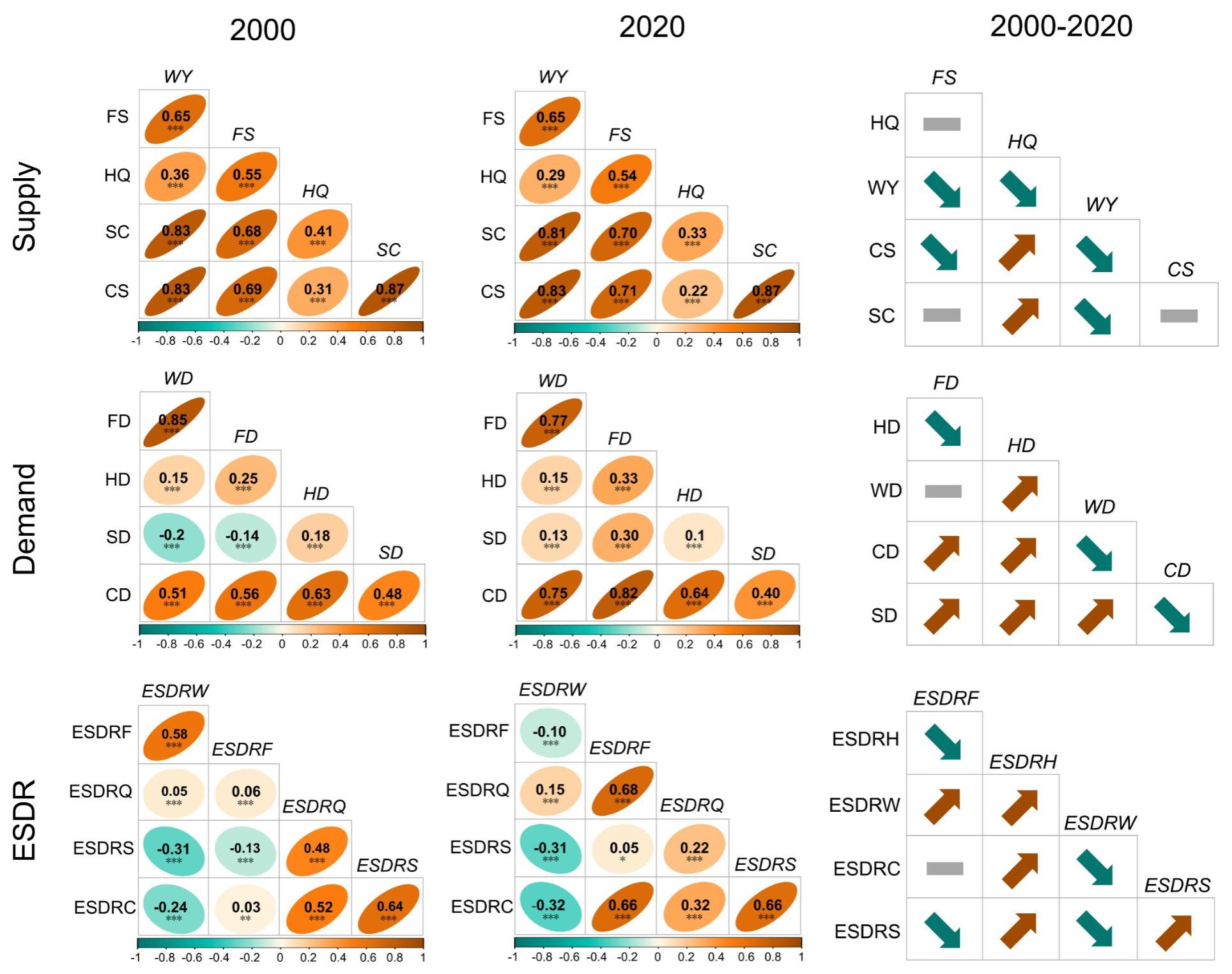 图4. 西北干旱区碳与碳相关的生态系统服务供给、需求和供需比的权衡与协同。(***表示在0.001水平上显著,**表示在0.01水平上显著,*表示在0.05水平上显著)橙色箭头表示相关性程度加强,绿色箭头表示相关性程度减弱。