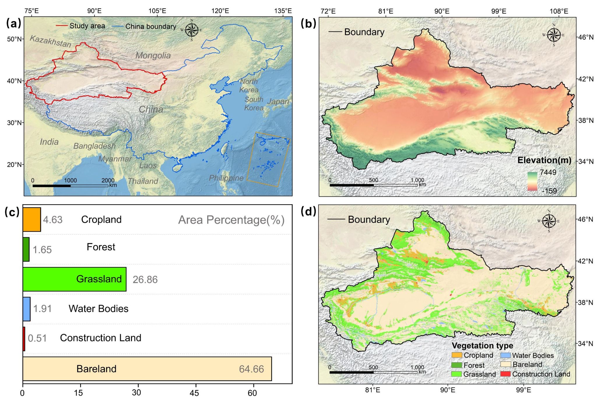 该研究成果于近日发表在国际学术期刊Journal of Cleaner Production(中国科学院一区TOP,影响因子9.8)上,yl6809永利官网韩永龙(硕士)为第一作者,新疆生态与地理研究所马晓飞(副研究员)和王勇辉(教授)共同指导。研究工作得到国家自然科学基金(42261051)、新疆天山青年人才顶尖计划(2023TSYCCX0078)、新疆维吾尔自治区重点实验室开放课题(2023D04073)以及新疆区域协同创新项目(2022E01014)的资助。
