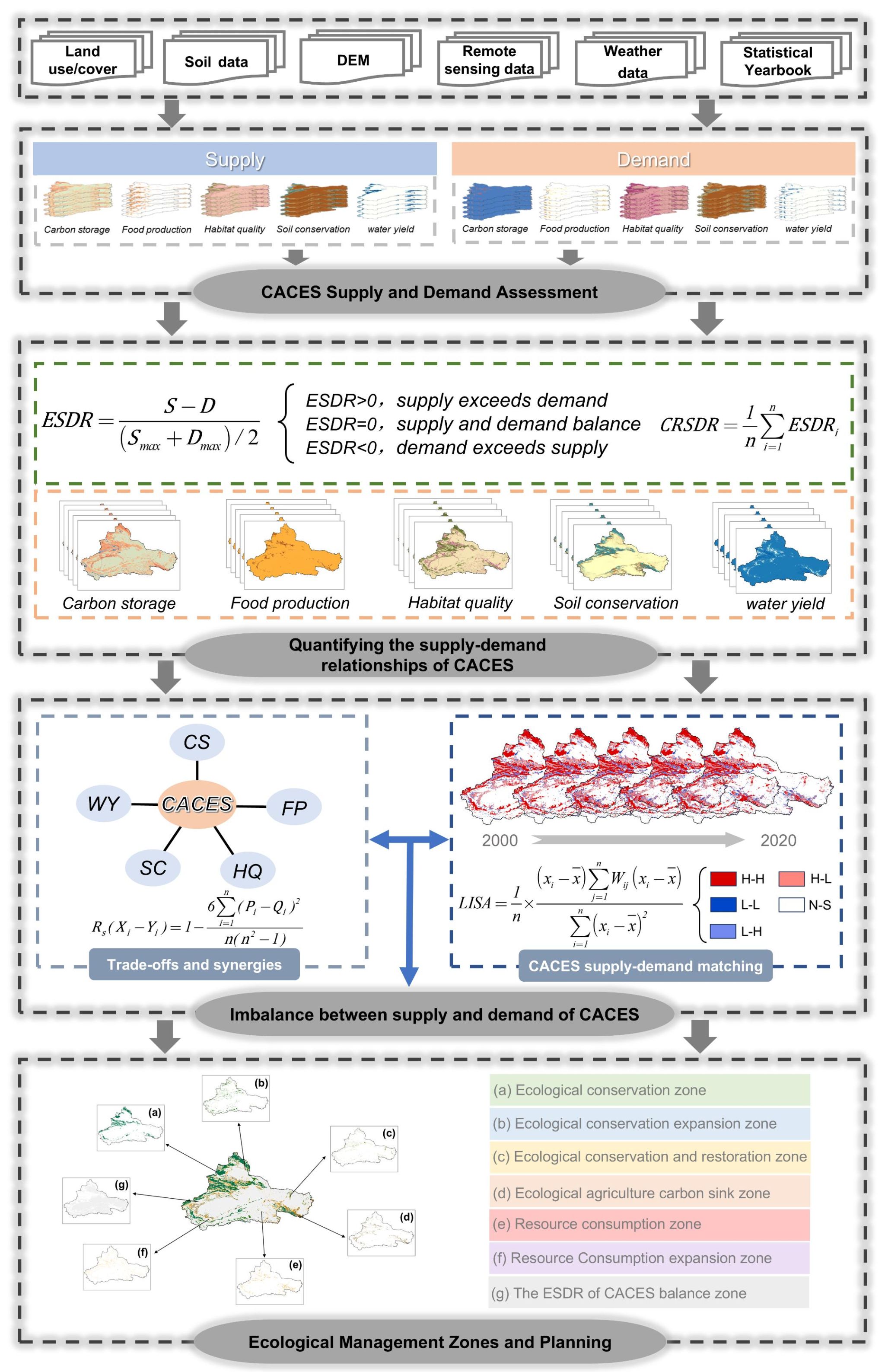 生态系统服务作为自然生态系统向人类提供的多种关键功能和资源,对区域可持续发展至关重要。然而,中国西北干旱区因气候干旱、水资源匮乏及人为干扰,其碳及各类生态系统服务的供需关系持续失衡,已严重制约当地的绿色发展。为应对这一挑战,在“双碳”目标背景下,永利官网王勇辉教授团队率先从碳视角提出了一套生态系统服务供需分析框架,并通过时空模拟,系统揭示了碳及相关服务的供需变化特征及其权衡协同机制。该研究不仅首次揭示了该区域生态系统服务的空间失配格局及演变趋势,还针对划分的七个生态管理区域提出了切实可行的高质量发展策略,为实现“双碳”目标和推进生态文明建设提供了关键参考。