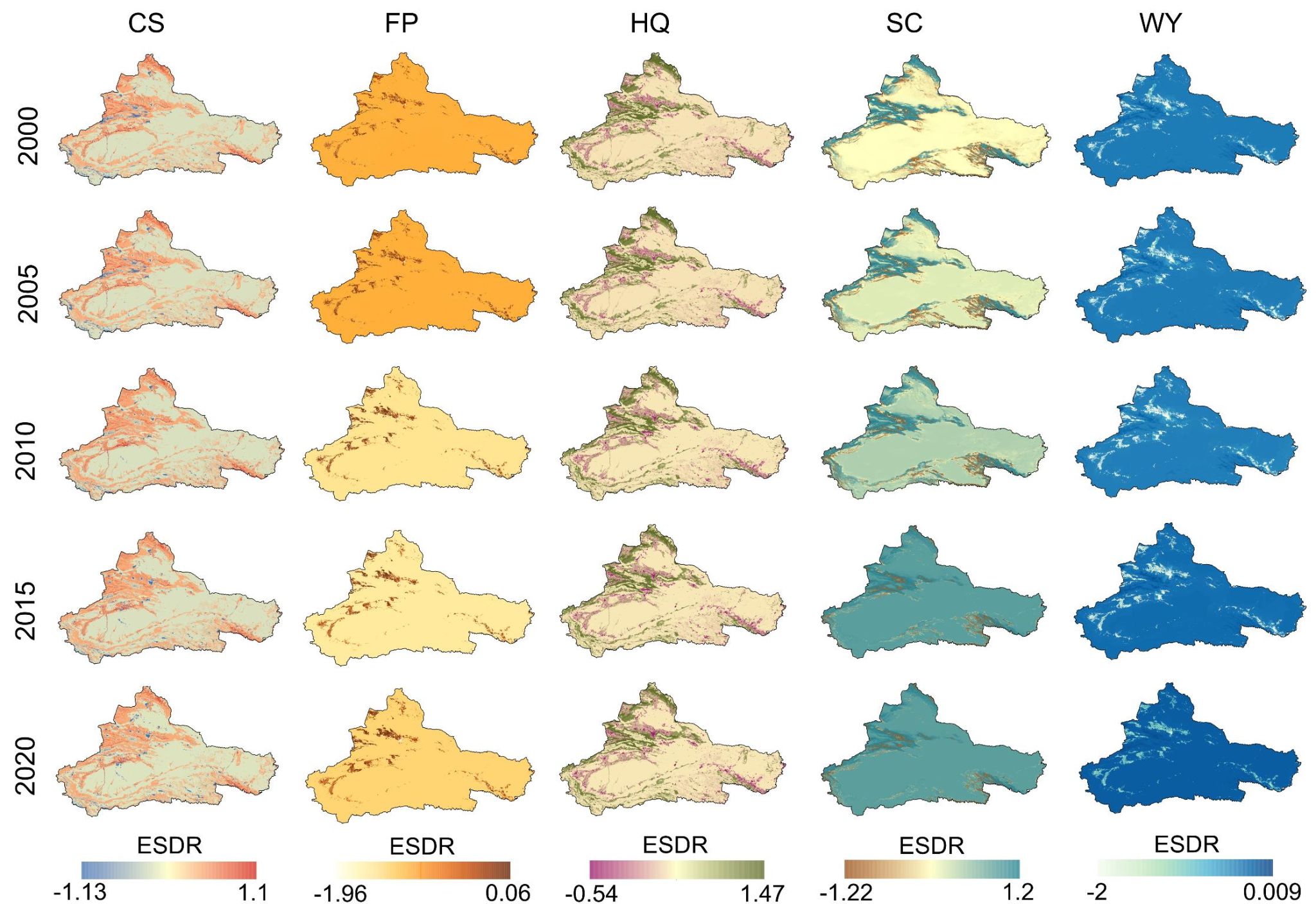 为了直观呈现碳中心生态系统服务的时空供需演变,本研究首先模拟并计算各项服务的供给与需求,并基于此构建供需比以评估区域失衡状况。图3表明,在研究期内,西北干旱区碳及相关生态系统服务的供给始终高于需求,呈现出明显的供给过剩格局,表明该区域在碳视角下的生态服务供需仍存在一定冗余。