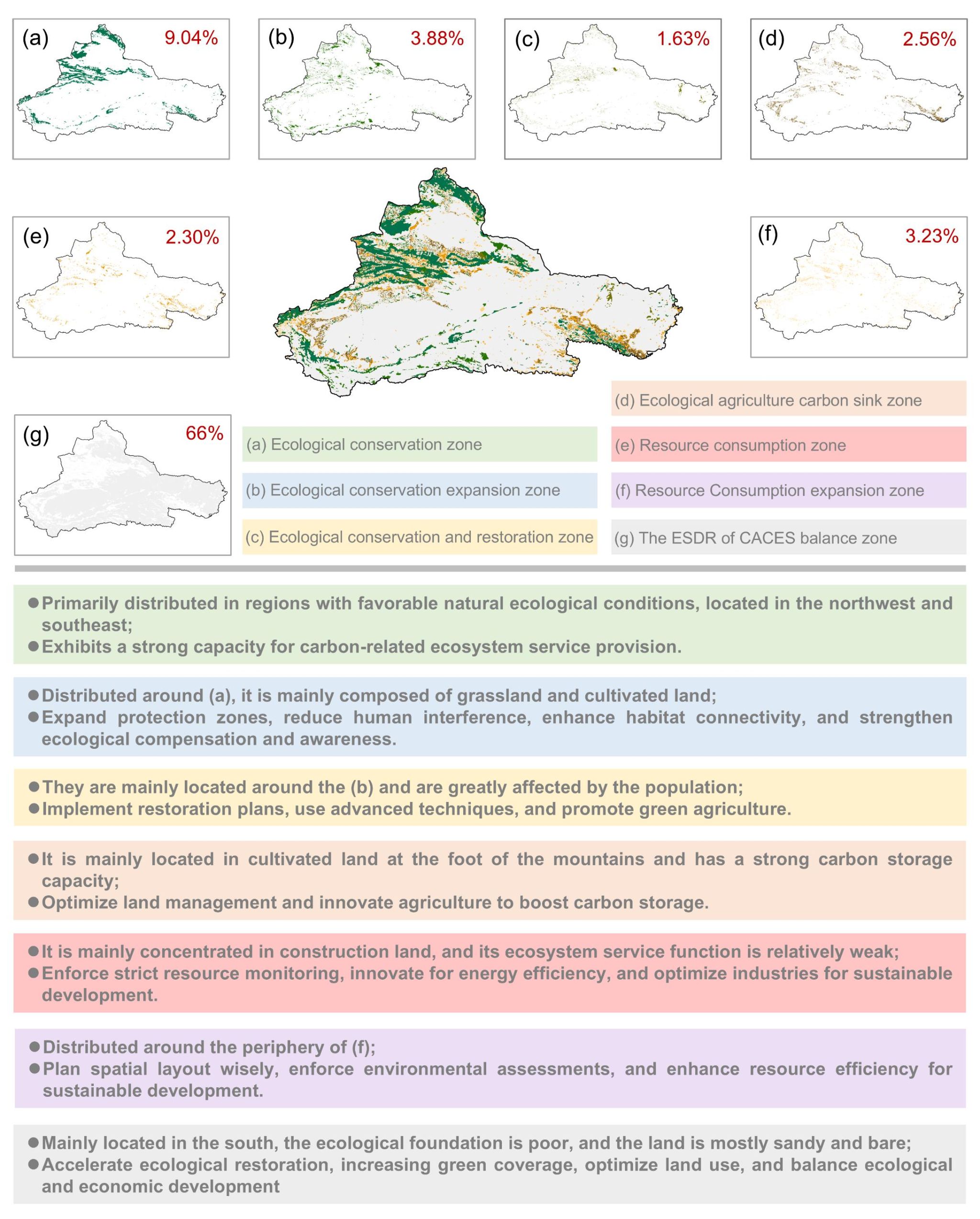 基于碳及相关生态系统服务供需匹配的空间格局,将西北干旱区划分为生态保护核心区、保护扩展区、生态修复区、农业碳汇区、资源消耗区、资源消耗扩展区和供需平衡区七大管理单元,并据此实施差异化策略:在核心区严守原生植被与生态完整;在扩展区建设生物廊道并实施生态补偿以强化连通;在修复区依托专业技术与动态评估推动退化土地快速恢复;在碳汇区推广精细化耕作与碳汇监测以提升碳储存潜力;在资源消耗区及其扩展区优化产业结构、强化能耗与资源监管以遏制过度消耗;在平衡区通过植被恢复、科学放牧与集约经营优化土地利用结构。该分区与管理方案为实现“双碳”目标下的区域生态安全与协调发展提供了坚实支撑。