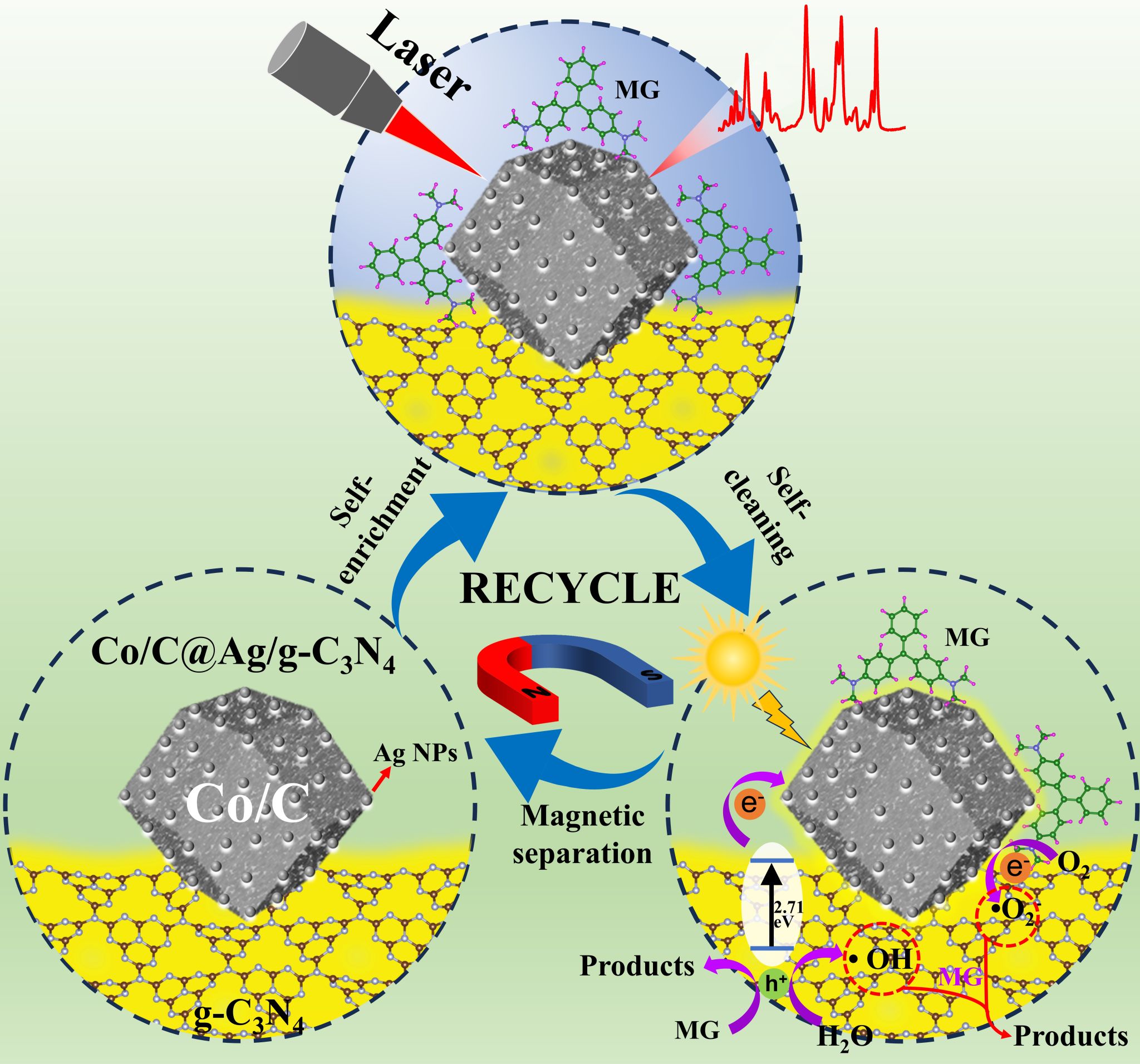 该工作报道了一种磁性纳米多孔碳基可回收SERS基底Co/C@Ag/g-C3N4的设计与制备,该基底可同时实现SERS检测和孔雀石绿的可见光催化降解。Co/C和g-C3N4能自发吸附并富集孔雀石绿分子至等离子体纳米颗粒附近,从而增强SERS响应。该基底可通过磁性收集从复杂基质中回收,并通过可见光催化降解再生,避免了SERS基底与复杂基质的共离心。该研究提出的自富集、自清洁和可回收特性的基底的新型策略大幅降低了检测成本,为制备和利用可回收的磁性SERS基底提供了重要参考。在食品安全和环境保护领域具有广阔应用前景。