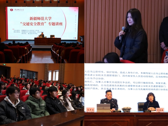 地理科学与旅游学院联合商学院、政法学院、数学科学学院承办交通安全教育专题讲座,特邀乌鲁木齐市公安局交通管理局快速路大队外环路中队中队长、一级警长冯彦斌为同学们讲解交通安全知识,200余名学生代表参加讲座。冯彦斌结合交通事故典型案例,针对校内外出行安全隐患、交通事故危害等问题进行安全教育,引导同学们自觉遵守交通法律法规,摒弃交通陋习,提高安全出行意识和自我保护能力,防止各类交通安全事故发生。