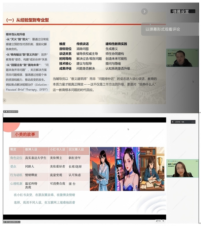 本次公益课由中国教育发展战略学会心理教育专业委员会和永利官网联合主办,党委学生工作部心理健康教育服务中心组织开展。课程特邀知名心理专家李勤与范蕊老师担任主讲嘉宾。讲座中,李勤老师提到谈心谈话是辅导员工作的“看家本领”,其本质是“以情动人、以理服人、以心育人”,并通过实例展示了如何运用心理学技巧提升与学生的沟通效果。范蕊老师则聚焦于学生自我认知水平的提升,结合数字媒体时代特征,解析线上人设与真实自我的关系,借助社会学视角探讨网络身份管理对心理健康的影响。