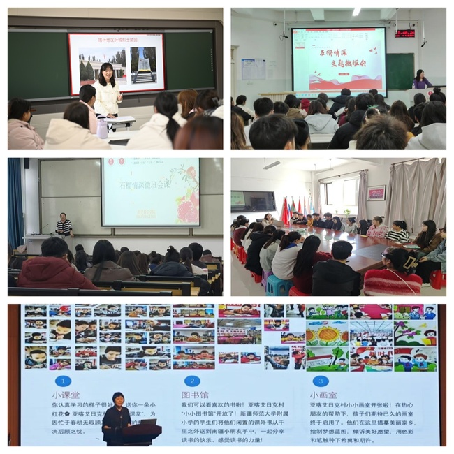 此外,各学院还通过多种形式讲述了各民族相互依存、共同发展的历史故事,生动展现了各民族如石榴籽般紧紧抱在一起的深厚情谊。教育科学学院教授冯江英讲述《一生只做一件事,我为祖国守边疆:向我们边境国门英雄致敬学习》、地理科学与旅游学院邀请物理与电子工程学院党委书记李莉讲述《和李妈妈一起静待石榴花开》、化学化工学院副教授杜虹讲述《石榴花话石榴》,数学科学学院党委副书记张培、商学院学工办主任阿丽也·吾买尔进班级深情讲述民族团结的故事。微班会课中,同学们积极提问并发言,分享了身边的民族团结事例和师生一家亲的温暖故事。