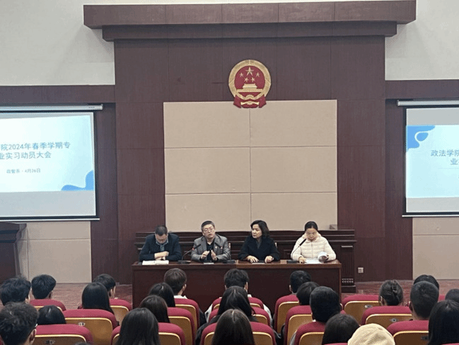 为进一步加强对我院学生的实习就业指导,让学生正确认知自身和社会的契合度,了解不同行业,确定未来走向,永利官网政法学院于4月26日下午在文科一号楼模拟法庭召开2024年春季学期专业实习动员大会。政法学院党委书记唐文睿、院长彭无情、副院长茹克娅·霍加、党委副书记李康、哲学系主任姚学丽、政管系主任王艳、法学系主任赵立、各实习班级学业班主任和实习指导老师参加会议。2021级公共事业管理、法学、法学(纪检)、政治学与行政学专业、宗教学五个专业共计261名学生参加会议。会议由各系主任主持召开。