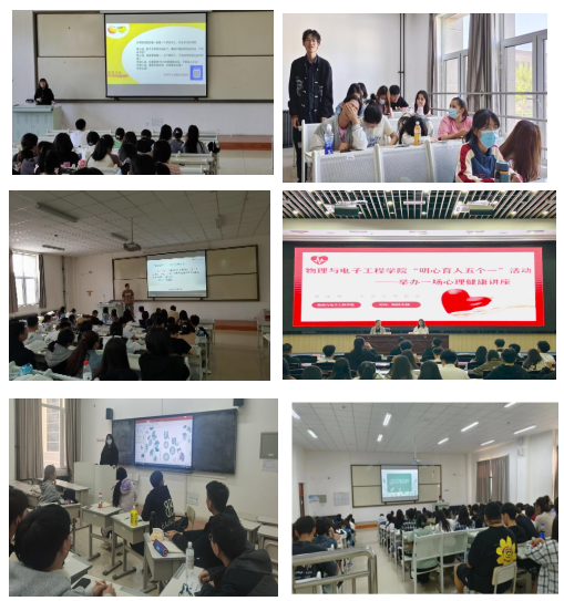 5月,美术学院组织从“心”出发,赋能前行—对话沙龙;体育学院、化学化工学院联合举办宿舍“心”成员团辅活动。心理学院开展“研语心路,助你成长”朋辈经验交流分享活动;外国语学院组织“学霸专业说”学习分享会;物理与电子工程学院开展“观影品书,书影相随”系列活动,品一段人生,悟一次成长。