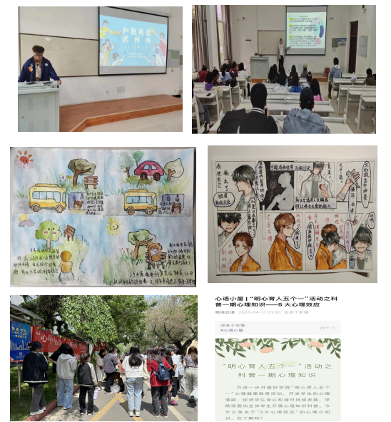 4月,马克思主义学院、商学院、政法学院、教育科学学院、心理学院、地理科学与旅游学院、化学化工学院、生命科学学院、音乐学院、预科学院分别在线上线下通过主题班会、微视频、漫画、微信推文等形式推进心理科普知识宣传。物理与电子工程学院、外国语学院、教育科学学院分别组织了爱情专题讲座;政法学院组织期末考试期间“挫折调试与压力管理”主题讲座;国际文化交流学院、商学院开展自我成长主题讲座。