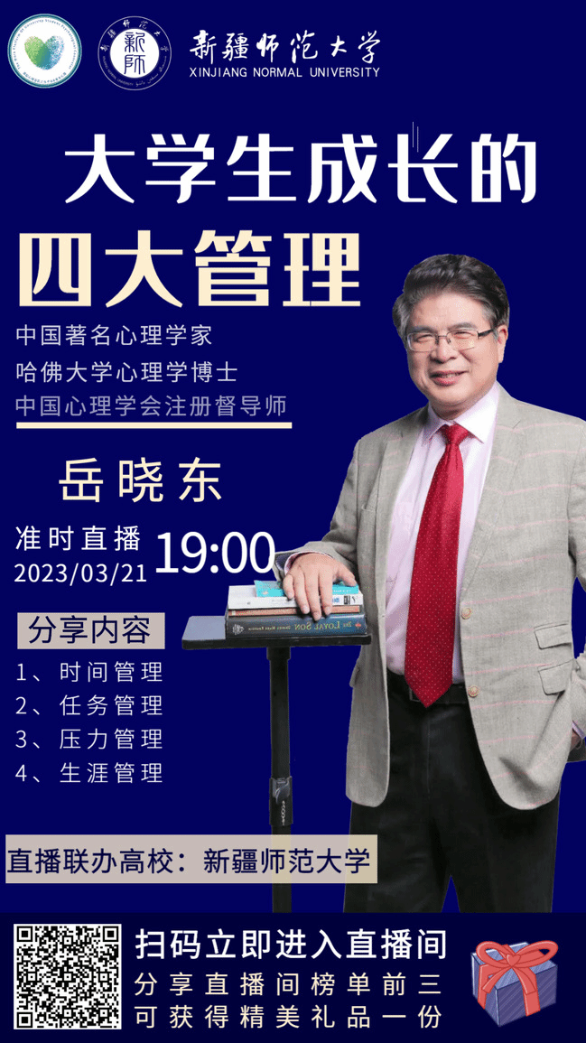 为加强永利官网心理健康教育工作,进一步体现心理委员示范单位引领作用,更好地帮助在校学生了解如何管理自己的大学生活,培养自我管理胜任力,提高大学生活质量,永利官网心理健康教育服务中心于3月21日联合全国心理委员工作平台邀请岳晓东博士做“大学生成长的四大管理”主题讲座。累计6638人次观看,500余名学生参与互动反馈。