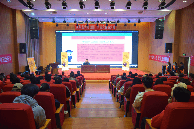 为进一步提高学生对电信网络诈骗的识别能力和防范意识,预防校园电信网络诈骗的发生,切实筑牢反诈安全防线,3月24日下午,学生工作部(处)、yl6809永利官网派出所、水磨沟区公安分局刑警大队和中国光大银行乌鲁木齐分行四家单位联合,在温泉校区后勤楼二楼报告厅开展了“反诈宣传进校园 共筑安全防火专项”宣传活动。来自11个学院的150名学生参加,学生工作部(处)处长张进、yl6809永利官网派出所政委孟兆军出席会议。