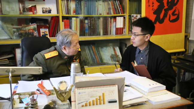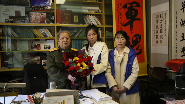 在干休所活动室,原中国人民解放军少将袁国祥为青年志愿者们作专题授课。“天再高,高不过我们解放军的脚底板。戈壁滩再大,大不过我们解放军的步伐……”在一个多小时的专题授课环节中,91岁高龄的袁国祥老将军作为大进军的见证者和记录者,结合亲身经历,用一个个动人的故事,生动形象地向大家讲述了当年未动一枪一炮和平解放新疆、屯垦戍边和进藏英雄先遣连解放阿里的历史。袁国祥在最后深情勉励广大学子,要坚定理想,勤于学习,敢于奋斗,珍惜当下宝贵的学习时光,以坚实的脚步、努力的拼搏,为新时代党和国家事业贡献力量。