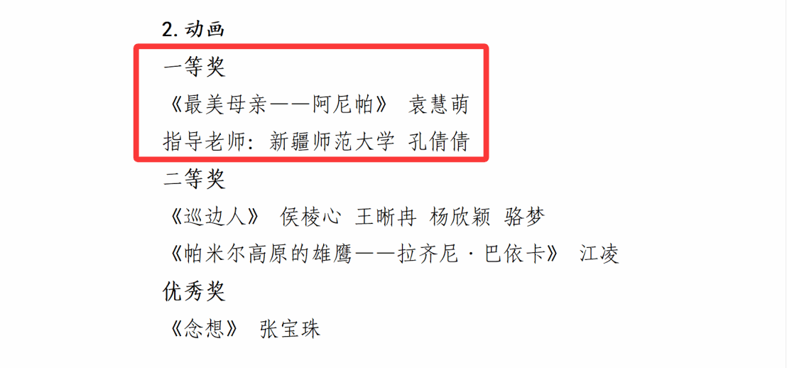 在第三届新疆动漫节系列活动中的“我心中那抹中国红”动漫作品征集大赛中,永利官网美术学院袁慧萌同学创作的动画作品《最美母亲——阿尼帕》荣获动画类一等奖,黄田同学的插画作品《天山下的绿色牧歌》获优秀奖,yl6809永利官网荣获“优秀组织奖”。