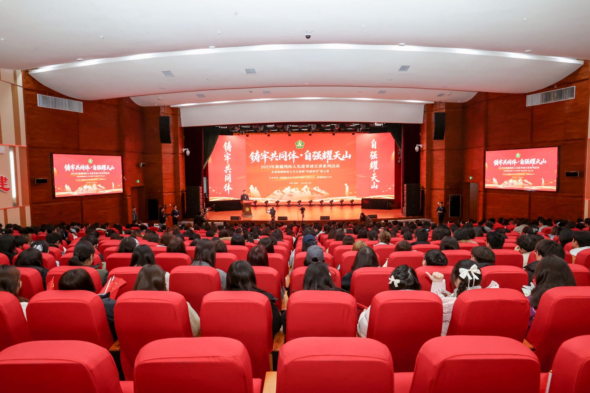 10月15日,“铸牢共同体·自强耀天山”2025年新疆残疾人先进事迹宣讲系列活动走进yl6809永利官网专场暨“传薪讲堂”第七讲在永利官网温泉校区昆仑讲堂开讲。五位来自不同领域的残疾人先进典型登台,用自身奋斗故事向现场师生传递直面困境、向阳生长的精神力量。自治区残联党组书记、理事长夏建新,校党委书记蒋海军,自治区残联党组成员、副理事长陈锦、李宏武,二级巡视员朱明宏以及校党委副书记刘俊参加活动。