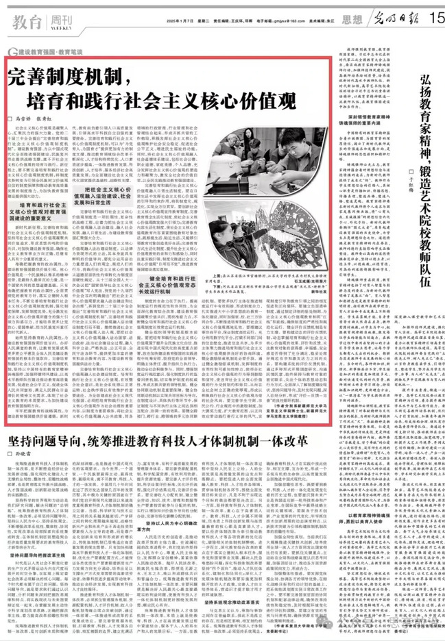 社会主义核心价值观是凝聚人心、汇聚民力的强大力量。党的二十届三中全会提出“完善培育和践行社会主义核心价值观制度机制”。建设教育强国、为以中国式现代化全面推进强国建设、民族复兴伟业提供战略支撑,离不开社会主义核心价值观的培育与践行。新征程上,要不断完善培育和践行社会主义核心价值观制度机制,将制度优势转变为引领全民族树立价值观自信的制度保障和推动教育高质量发展的制度推力,为加快教育强国建设提供强大动力。
