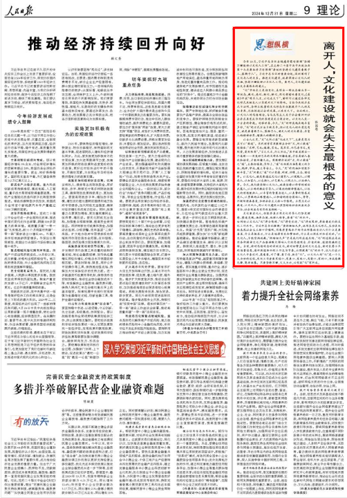 今年10月,习近平总书记在福建考察时强调“坚持不懈做好以文化人工作”,在主持二十届中共中央政治局第十七次集体学习时强调“要始终坚持文化建设着眼于人、落脚于人”。习近平总书记的重要论述,深刻阐明了文化与人的关系。推进文化建设,就要深悟以文化人的内涵,坚持不懈做好以文化人工作。离开人,文化建设就会失去最根本的意义。