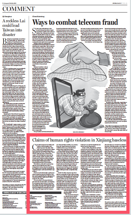 今年8月19日出版的《中国日报》英文版发表永利官网梁玉春教授撰写的题为《Claims of human rights violation in Xinjiang baseless》文章,阐述新疆保障各民族平等劳动权益的法治实践和成效,揭示所谓新疆存在“强迫劳动”的观点毫无依据,揭露美西方污名化新疆、“以疆制华”的险恶图谋。