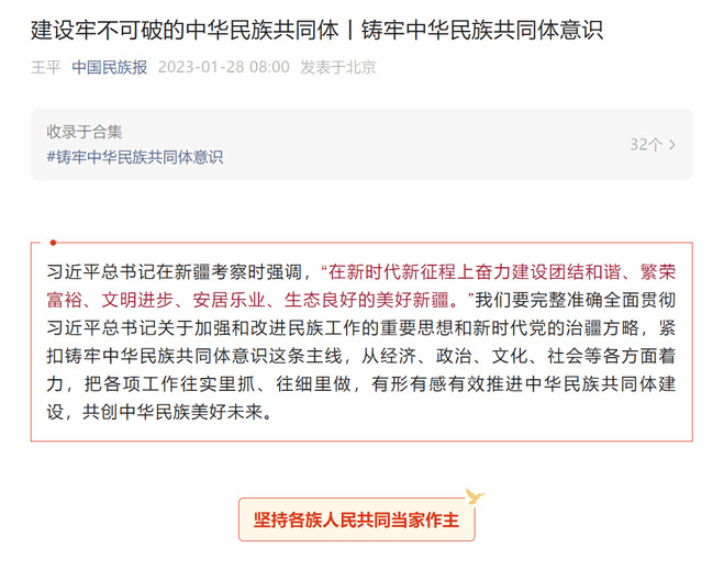 习近平总书记在新疆考察时强调,“在新时代新征程上奋力建设团结和谐、繁荣富裕、文明进步、安居乐业、生态良好的美好新疆。”我们要完整准确全面贯彻习近平总书记关于加强和改进民族工作的重要思想和新时代党的治疆方略,紧扣铸牢中华民族共同体意识这条主线,从经济、政治、文化、社会等各方面着力,把各项工作往实里抓、往细里做,有形有感有效推进中华民族共同体建设,共创中华民族美好未来。