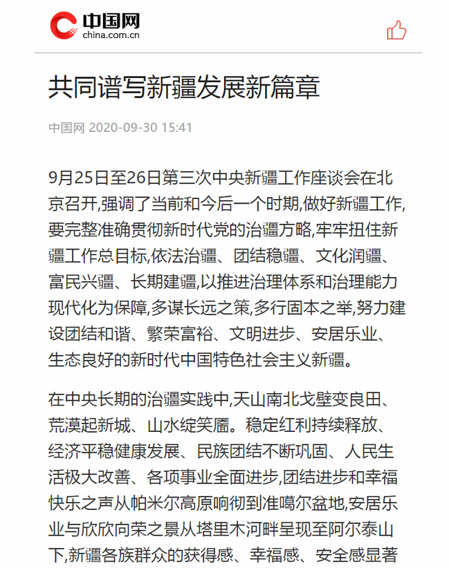 9月25日至26日第三次中央新疆工作座谈会在北京召开,强调了当前和今后一个时期,做好新疆工作,要完整准确贯彻新时代党的治疆方略,牢牢扭住新疆工作总目标,依法治疆、团结稳疆、文化润疆、富民兴疆、长期建疆,以推进治理体系和治理能力现代化为保障,多谋长远之策,多行固本之举,努力建设团结和谐、繁荣富裕、文明进步、安居乐业、生态良好的新时代中国特色社会主义新疆。