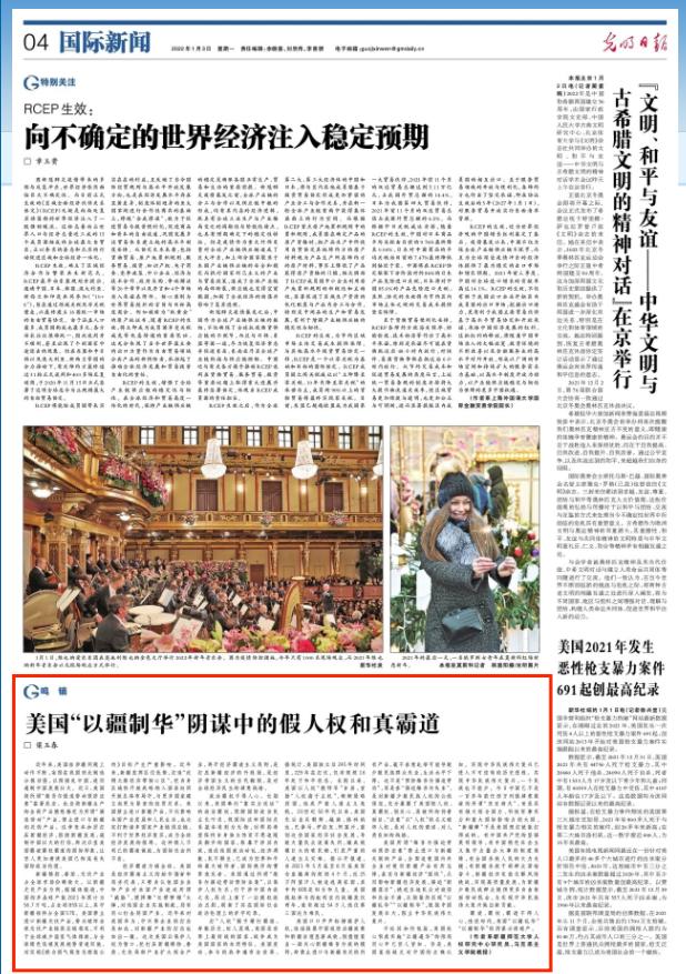 不论其如何包装,美国处心积虑实施“以疆遏华”的险恶用心早已世人皆知。但是,美国显然缺乏对中国的正确认知。实现中华民族伟大复兴已进入不可逆转的历史进程。实现中华民族伟大复兴,一个民族也不能少。今日中国已不是一百多年前任西方列强肆意欺凌的所谓“东亚病夫”,而是具有强大综合国力、科技军事实力和重大国际影响力的大国,“新疆牌”不是美国想打就能打得成的。有中国共产党的坚强英明领导,有中国特色社会主义集中力量办大事的制度保障,有全国各族人民的大力支援,有新疆各族干部群众团结奋斗,新疆经济定能化解风险挑战,实现高质量发展,为新疆少数民族群众提供更多自由体面劳动机会,为实现中华民族伟大复兴做出新贡献。