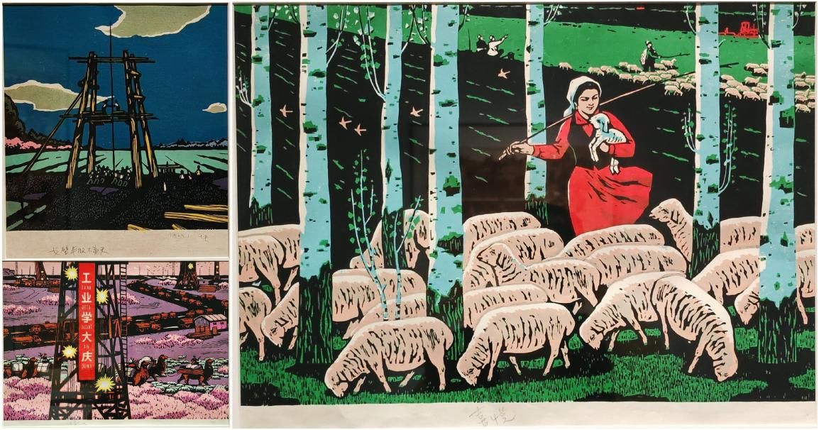 葛德夫《戈壁丰收不靠天》《工业学大庆》等作品明显吸收了北大荒版画刀法粗犷、色彩浓烈的风格特点,描绘新疆生产建设兵团屯垦戍边,建设边疆工业化等时代变革的场景。作品《喜悦》将本土游牧场面与新疆工业变革相融汇,展现农牧业向工业化的转变。画面风格在保留北大荒版画特点的基础上更加趋于细腻柔和,画面从描绘宏大的工业生产转向表现日常放牧的小场景,丰富了新疆版画创作图式。叶毓中《帕米尔》用方形团块构图描绘帕米尔高原上塔吉克族节日欢庆景象。此类跨地域实践不仅拓展了新疆主题创作的思路,诠释边疆美术与中华文化之间在生活方式、民俗活动、文化传统等方面的深层共性,推动边疆图像与中国美术现代化的有机衔接。