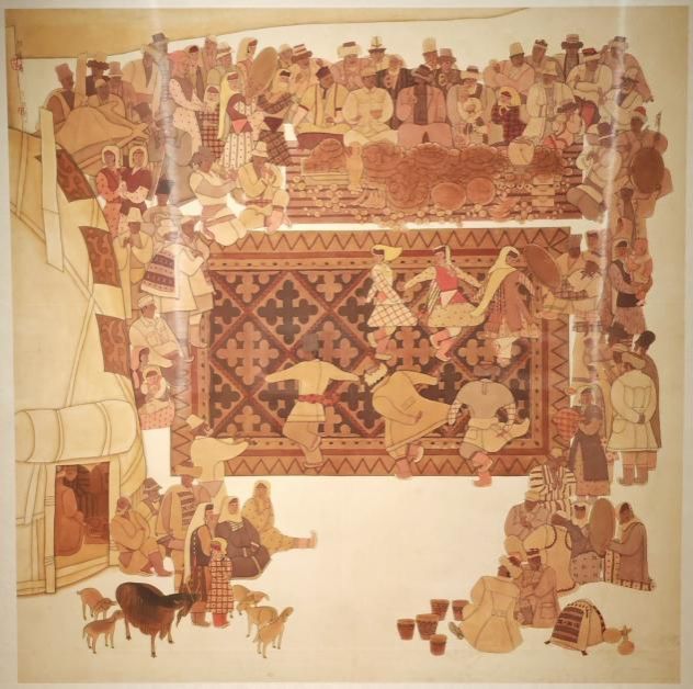 “守正”并非固守传统,而是对文化基因的创造性激活。在多重语境下,新疆美术呈现出融汇创新的特点。在研学传统美术语言的基础上找到语言共性,新疆美术在“守正”的基础上不断探索美术语言的丰富性,展现时代特性,实现从传统绘画表现手法逐步向图式语言、综合表现的探索。这些作品既蕴含传统美术特点,又彰显新技术新形式,直观地展现了“创新”不是无根之木,要在掌握本土文化特征的基础上,深挖美术作品的当代性。莫合德尔·亚森的《英阿瓦提的人们》突破油画写实传统,大胆地对人物形象进行结构性概括,减弱色彩对比,以结构性概括融合中国传统色彩观,画面呈现柔和文雅的东方意蕴。涂少辉的综合材料作品《星河记忆2》将绢本国画与装置相融合,作品在保留传统国画气韵的基础上,利用装置艺术的视觉冲击力特性,加强国画的精神穿透力。李开的《一路向西》在版画作品中融合了设计平面构成的特点,利用疏密和画面分割展现自己对传统与现代、现实与超现实之间的思考。这些尝试不是简单的美术语言创新,而是画家将中西方艺术表现方式对当代美术语言的多元性探索。