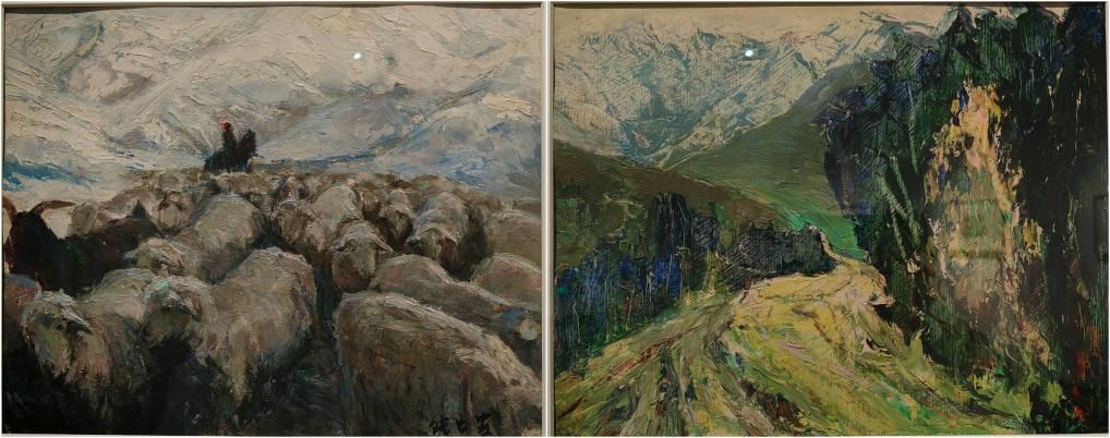 画家饶书贵注重新疆地域气候与用色习惯,探索“浓水浓色直接画”的水彩技法。画面通过饱满的水分调色,将新疆热烈通透的阳光,白色的羊群,青翠的山峦用纯净的原色描绘,在画面上构建心中的新疆色彩。艺术家通过专业艺术实践探索突破地理与时间的局限,使个体形象与国家形象在美术中形成稳固关联,折射出一个集体,一个时期的精神面貌和时代特征。