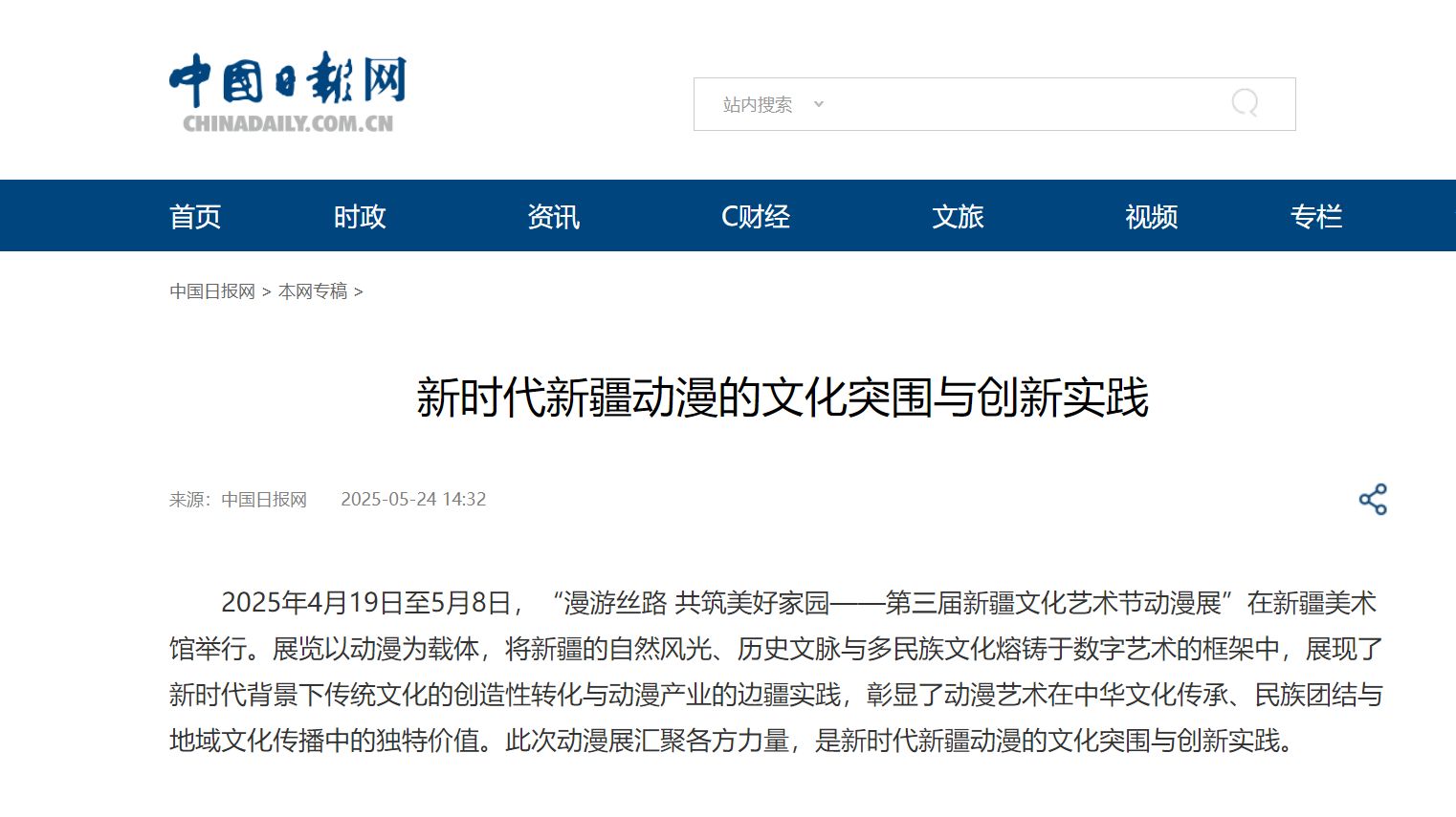 2025年4月19日至5月8日,“漫游丝路 共筑美好家园——第三届新疆文化艺术节动漫展”在新疆美术馆举行。展览以动漫为载体,将新疆的自然风光、历史文脉与多民族文化熔铸于数字艺术的框架中,展现了新时代背景下传统文化的创造性转化与动漫产业的边疆实践,彰显了动漫艺术在中华文化传承、民族团结与地域文化传播中的独特价值。此次动漫展汇聚各方力量,是新时代新疆动漫的文化突围与创新实践。