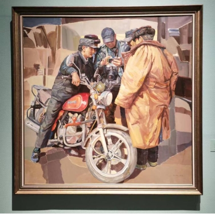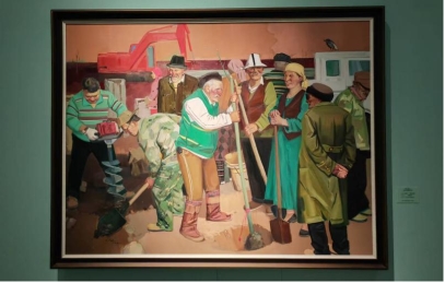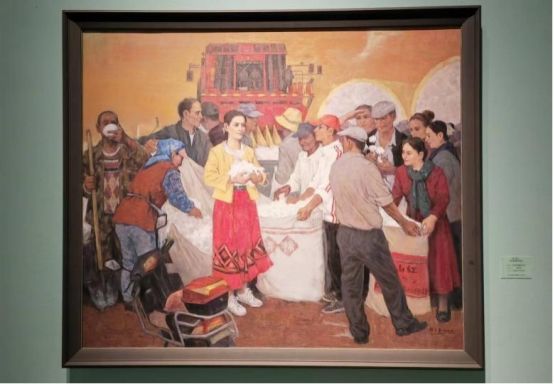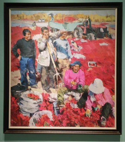 多年以来新疆的画家们始终坚持以人民为中心的创作导向,通过聚焦新疆各民族间交往交流的日常生活,将艺术的理想与人民生活紧密结合,写实的画面真实地表达着新疆社会稳定、人民安居乐业的良好氛围。如李勇的《高原朋友圈》、波里亚的《杏熟季节》、邓乐平的《大美兵团盛世丰年》、解彬的《晒幸福》、谢勇琪的《丝路——绿色家园》等,以各自的视角描绘了一幅幅生动火热的生活场景,也是新时代以来新疆从脱贫攻坚到乡村振兴,实现跨越式发展的缩影。写实的人物形象与概括的图形化背景相结合,艺术的升华让新疆各族人民的幸福感跃然可见。