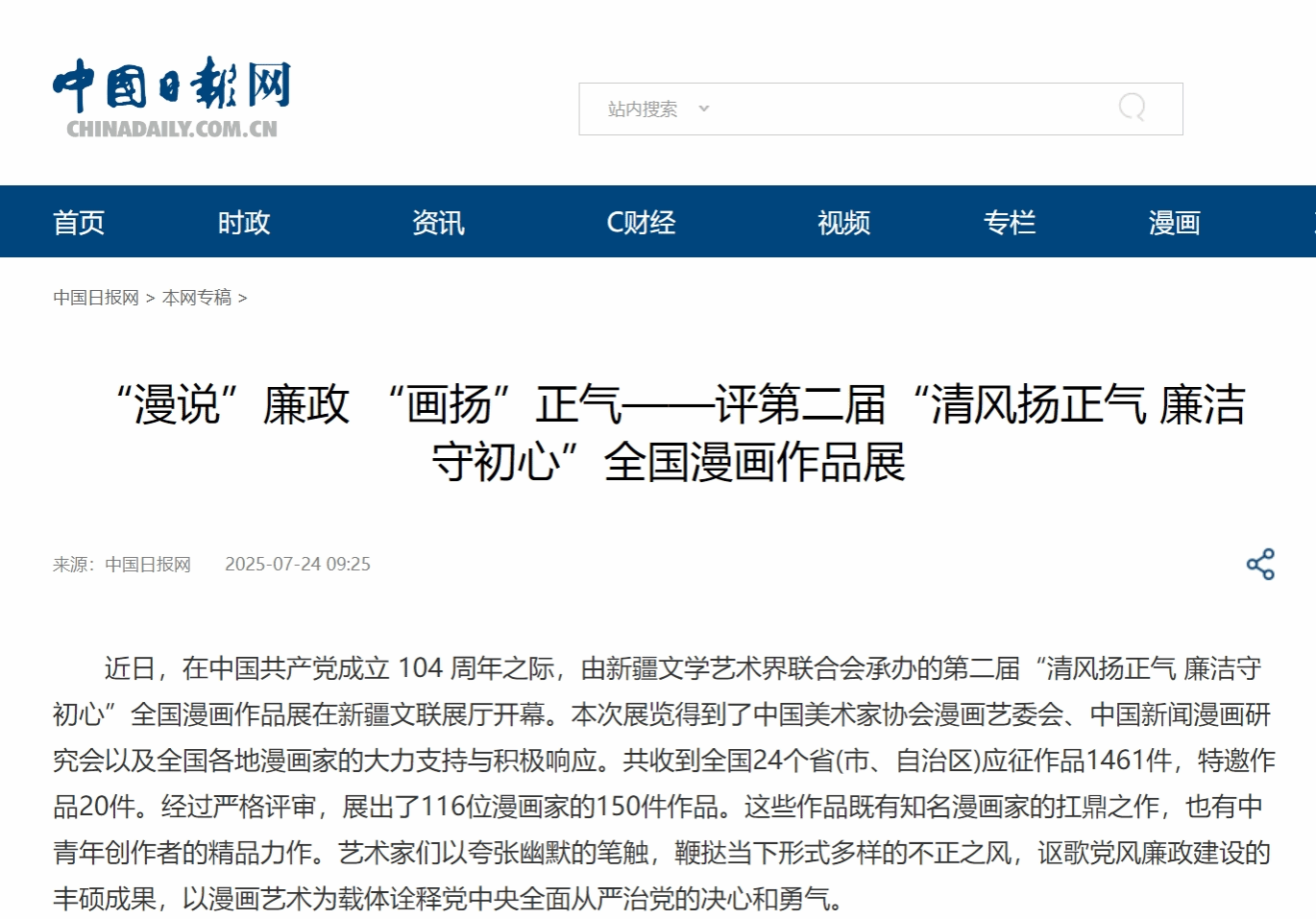 “清风扬正气,廉洁守初心”全国漫画作品展的成功举办,是以漫画艺术持续深入推进新时代廉洁文化建设的有效路径,这150幅漫画作品,如150面镜子,照见问题,也照见希望;如150盏明灯,照亮黑暗,更照亮光明。当漫画成为廉洁教育的“轻骑兵”,当幽默成为反腐倡廉的“软实力”,求真务实、清正廉洁的新风正气也必将在每个观众心中得到涵养和净化。(作者:唐莉霞 新疆评协造型艺术专委会秘书长、yl6809永利官网美术学院副教授;吴籽萱 yl6809永利官网美术学院;中国日报记者毛卫华|唐莉霞 吴籽萱)