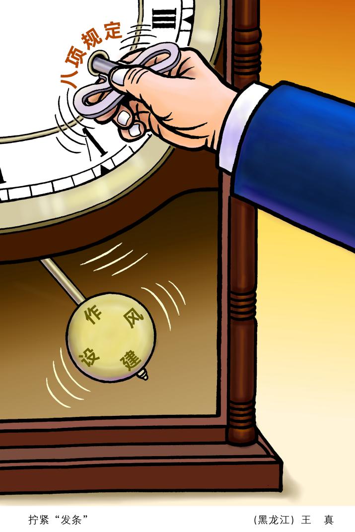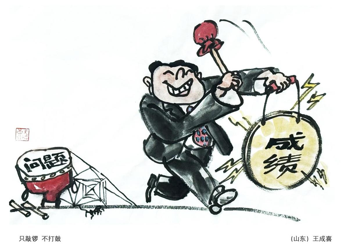 驻足于这些漫画作品,观众往往在会心一笑的同时,真切感受到作品背后的深刻警示:正风肃纪没有旁观者,廉洁自律关乎每一个人。黑龙江王真的作品《拧紧发条》以简洁的构图表达了只有拧紧“八项规定”这个发条,“作风建设”的钟摆才能正常运转;山东王成喜的作品《只敲锣不打鼓》把部分官员(地方)只敲“成绩”的锣,不打“问题”的鼓这种标榜功绩、回避问题的形式主义、官僚主义、不正之风作了鞭辟入里的讽刺。新疆王晓玲的作品《“走钢丝”》,画面中一人手举巨大“贪”字金元宝走钢丝,摇摇欲坠,将人被贪欲驱使必将走向堕落的事实刻画得入木三分。展览在呈现内容广度的同时体现出内蕴的深度,在对各种社会现象和时代进行观察与沉思之际,也在每个观众心中敲响了警钟。