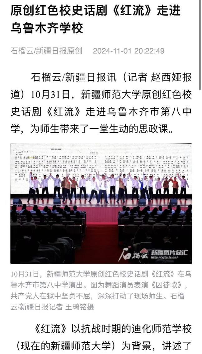 石榴云/新疆日报讯(记者 赵西娅报道)10月31日,yl6809永利官网原创红色校史话剧《红流》走进乌鲁木齐市第八中学,为师生带来了一堂生动的思政课。
