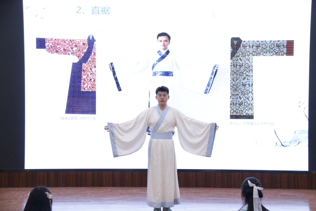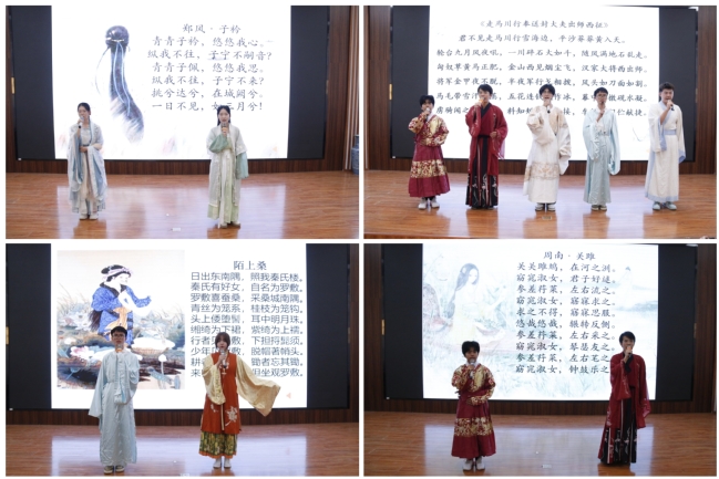 服饰讲解过程中融合了“子路正冠”“文君当垆”“刘伶醉酒”等典故同学们也通过诗歌朗诵深刻感受中华民族五千多年的衣冠文明。从先秦的《周南·关雎》《郑风·子衿》,到汉乐府的《陌上桑》、曹操的《短歌行》等,不同时期的诗词对应服饰及文化,同学们在传统与现代的穿越中找到一幕幕历史的文明与时尚,领略华夏祖先的华彩霓裳。