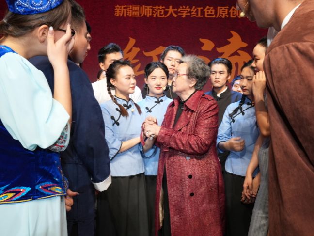 演出结束后,剧中人物、曾在师范学校任教的共产党人文斐然、许亮、刘子平的亲属王星汉、许健康、马苏苏,曾任省立一中校长、巴楚县县长的共产党员李云扬之子李胜利以及永利官网建校第一任校长高琳之女高峡受邀上台,由学生代表献花并向他们致敬。刘子平的外甥女马苏苏在讲话时潸然泪下,感谢师生没有忘记自己的父辈,回溯了自己孩童时期在新疆的狱中记忆和抗争故事,深情讲述令在场观众热泪盈眶。