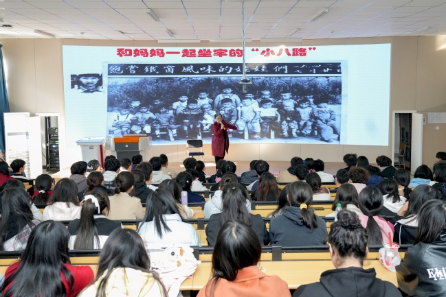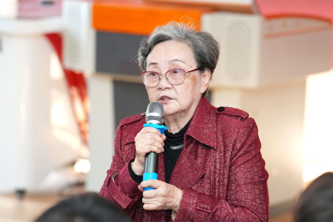 随后,暨南大学关心下一代工作委员会“五老”宣讲团成员、新闻与传播学院退休教师马苏苏教授作为主讲嘉宾,以自己的名字为引,深情讲述了她与父母在新疆乌鲁木齐监狱中那段艰苦卓绝的红色革命历史故事“饱尝铁窗风味的娃娃们”。父母及革命前辈们坚定的信念与不屈不挠的斗争精神,时至今日仍然在马苏苏的记忆里历久弥新。讲起这段经历,马苏苏多次激动哽咽、热泪盈眶。情到深处,她现场吟唱了妈妈教的狱中儿歌《小八路坐牢》《我们要做好儿童》,在场人员无不深受触动。