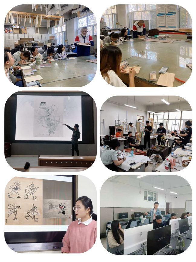 美术学院大学美育教研室开设《版画技法体验课》《人物速写》《短片的力量》《中国优秀动画赏析》《虚拟的真实——定格动画创作》课。在版画课上,学生充分了解了版画的历史起源、发展、分类等相关知识,拓展了眼界,对版画产生了浓厚的兴趣。速写课上,学生了解速写的基本知识,掌握绘画技巧,也增强了对绘画的兴趣。《短片的力量》《中国优秀动画赏析》《虚拟的真实——定格动画创作》课上,教师播放十余部不同类型的定格动画短片,从制作的角度讲解定格动画的类型、拍摄技巧、拍摄步骤。通过此类课程,采用更加有趣的教学方式吸引学生的注意力,加上构思创新互动环节,充分调动学生自主学习的积极性,提高学生对中国传统民间艺术的兴趣。