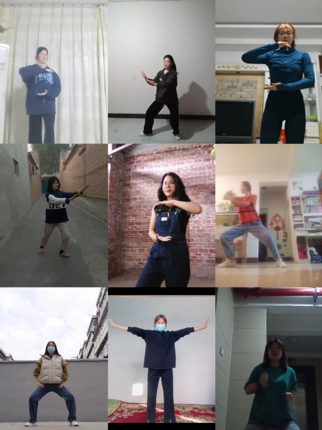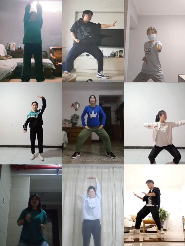 中华武术文化体验与实操课程是学校美育教育的一项重要内容。在本学期的线上教学过程中,师生在课程直播中同步开启摄像头,共同练习武术相关动作。教师提前录制好武术动作视频供学生在课后观看模仿,并设置课后打卡作业任务要求学生上传武术操练视频。线上课堂并未影响师生间的交流与沟通,实现了课程传达武术文化要义,展现武术动作风采的目的。