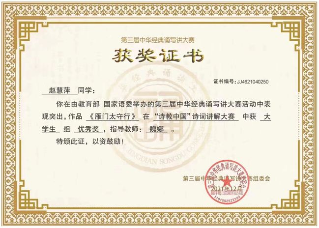 2020级中国古典文献学专业研究生赵慧萍获大学生组优秀奖