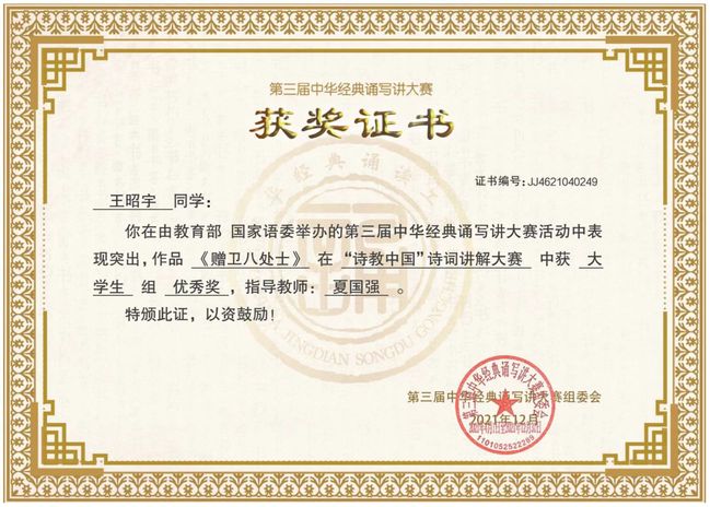 2020级中国古代文学专业研究生王昭宇获大学生组优秀奖