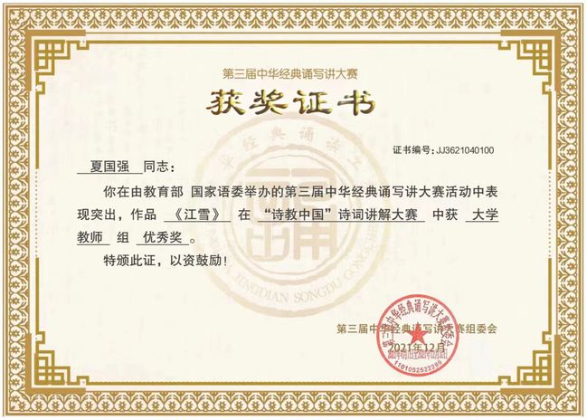 中华经典诵写讲大赛是国家教育部、国家语言文字工作委员会为贯彻落实中共中央办公厅、国务院办公厅《关于实施中华优秀传统文化传承发展工程的意见》,落实全国语言文字会议精神,全面深入实施中华经典诵读工程而举办的全国性竞赛。在本届诗词讲解大赛中,由永利官网教师夏国强、魏娜分别指导的学生王昭宇、赵慧萍是新疆地区大学生组中仅有的两位获奖选手,夏国强为新疆地区大学教师组两位获奖教师之一。