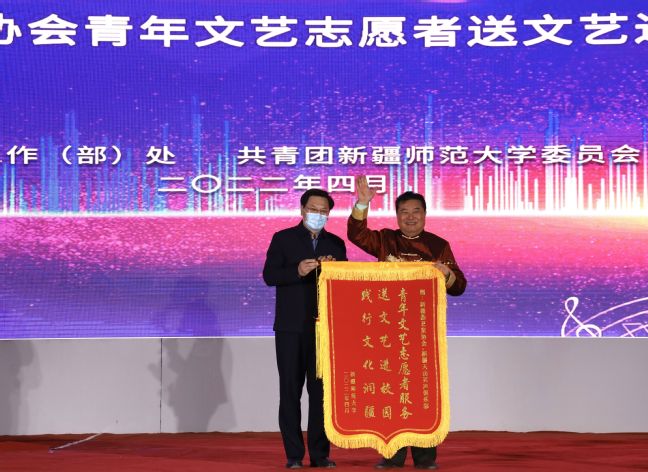 高靖代表学校党委向自治区曲艺家协会和天山笑声俱乐部赠送锦旗