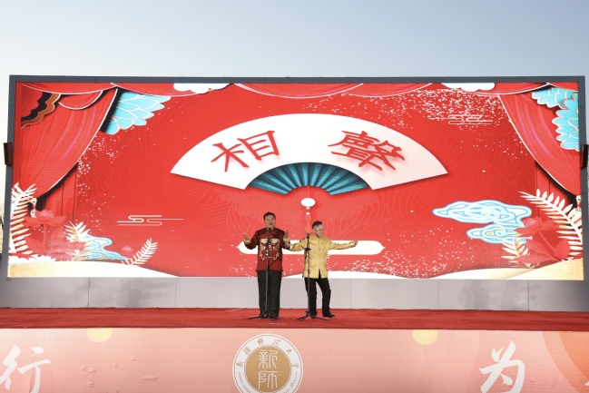 演出现场,自治区曲艺家协会主席、国家一级演员、天山笑声俱乐部主席高建新,中国曲艺家协会会员、兵团曲艺家协会副主席荣卫,自治区曲艺家协会理事、天山笑声俱乐部秘书长王洋,乌鲁木齐市艺术剧院青年舞蹈家木巴拉克· 斯坎旦尔,新疆本土著名相声演员王欢乐、朱国平为现场师生带来了精彩的相声和歌舞表演,现场掌声不断,好评如潮。高靖代表学校党委向自治区曲艺家协会和天山笑声俱乐部赠送锦旗,感谢两家单位在永利官网传承中华优秀传统曲艺文化,推动新时代曲艺文化进校园工作中所做出的贡献。
