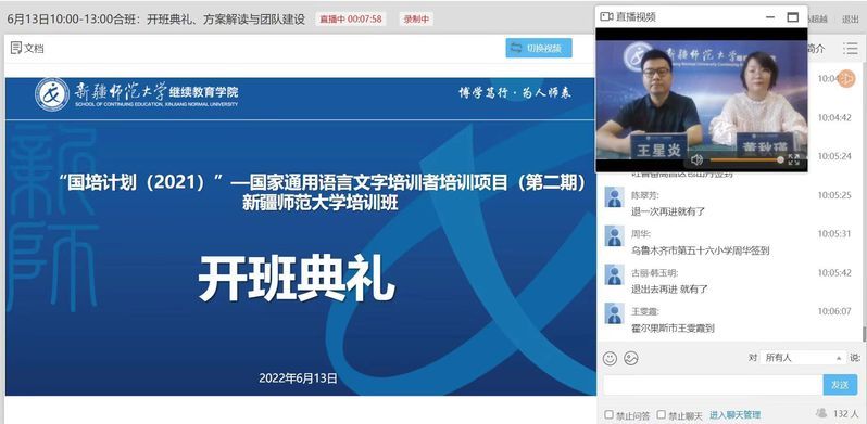 开班典礼上,继续教育学院副院长王星炎介绍了此次项目的设计思路,强调了新时代推广普及国家通用语言文字的重要意义,希望参训教师努力践行新时代教师培训者责任担当。随后,继续教育学院教师培训办公室主任董秋瑾就本次培训的项目实施背景、目标任务、课程设计、培训安排、研修任务、考核要求以及培训服务团队作了详细说明。乌鲁木齐市经济技术开发区(头屯河区)教研室中学语文教研员刘康老师代表参训教师进行发言。