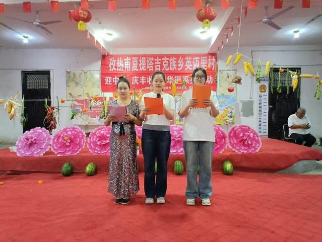 为喜迎中秋节、农民丰收节和国庆节,营造浓厚的文化氛围,展示村民劳动成果,激发勤劳致富的内生动力,呈现丰收的喜悦,9月16日晚上,学校驻莎车县孜热甫夏提塔吉克族乡英迈里村工作队联合村“两委”,开展2024年“喜迎中秋促团结 欢庆丰收增信心,感恩祝福贺华诞”主题庆祝活动,干部群众120余人参加。活动由村干部哈妮萨罕·马合木提和实习生周怡伶主持。